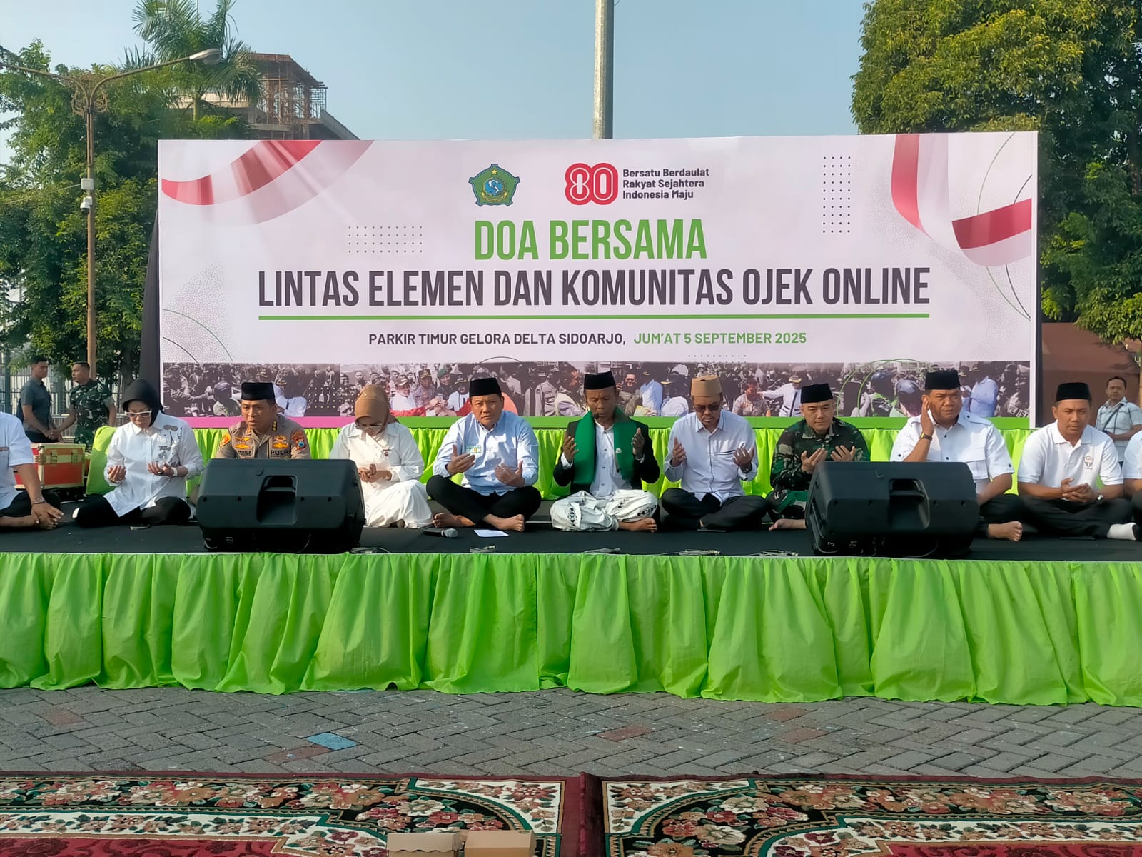 SIDOARJO, kasatmata.id – Forkopimda bersama lintas elemen termasuk mahasiswa dan ribuan Driver Ojek Online (Ojol) Sidoarjo menggelar doa bersama, yang berlangsung di Parkir Timur GOR Sidoarjo, Jumat (5/9/2025).