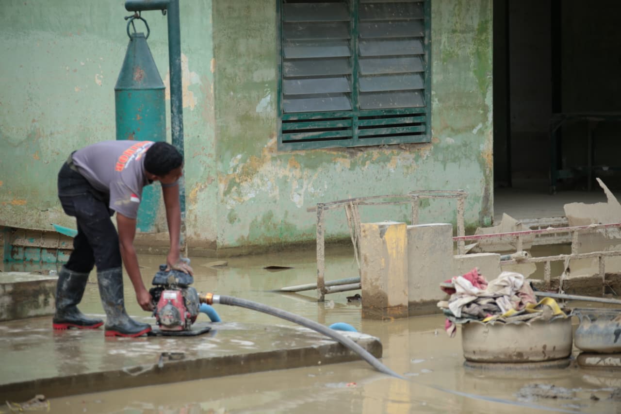 Hari ini Pasukan gabungan Korbrimob Polri dan Brimob Polda Aceh mengerahkan Personel dan peralatan yang dimiliki untuk bantu kuras air yang menggenang di Markas Komando Kompi Senapan A Yonif 111 / Karma Bakti, Aceh Tamiang.